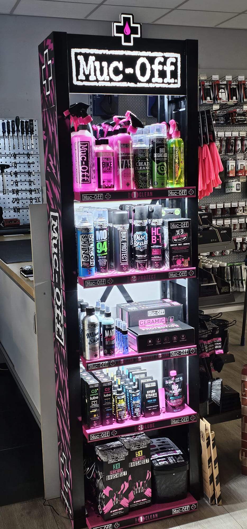 Muc-Off producten. Voor de beste zorg voor uw fiets! Zeker tijdens de wintermaanden is het belangrijk om uw fiets goed schoon te houden, zodat extra slijtage voorkomen wordt. Kom langs voor vragen en advies van onze poets-experts!